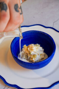 • Poner un montoncito de ensaladilla en el plato y salsear con un poco de salsa mahonesa ligera.