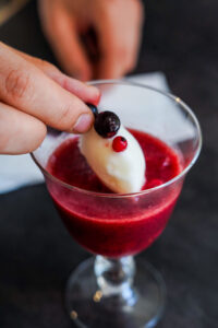 2. Mezclar los frutos rojos, el agua, el zumo y el azúcar en un vaso batidor y triturar.