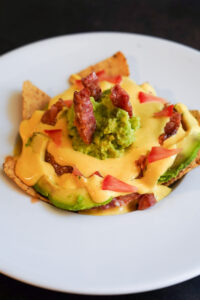 - Servir los nachos con la salsa cheddar y la longaniza por encima.