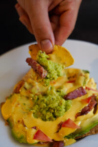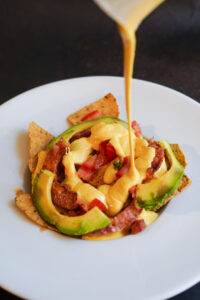 - Servir los nachos con la salsa cheddar y la longaniza por encima.