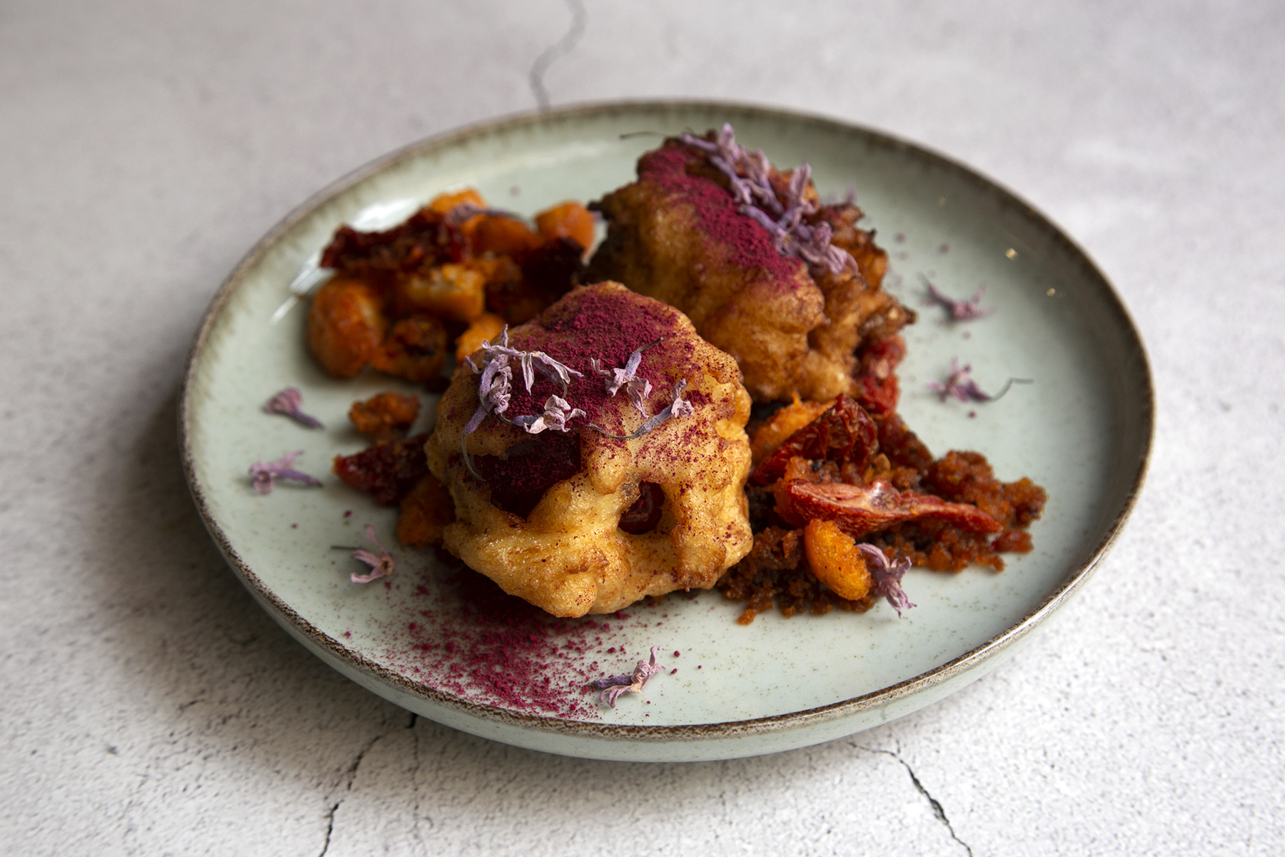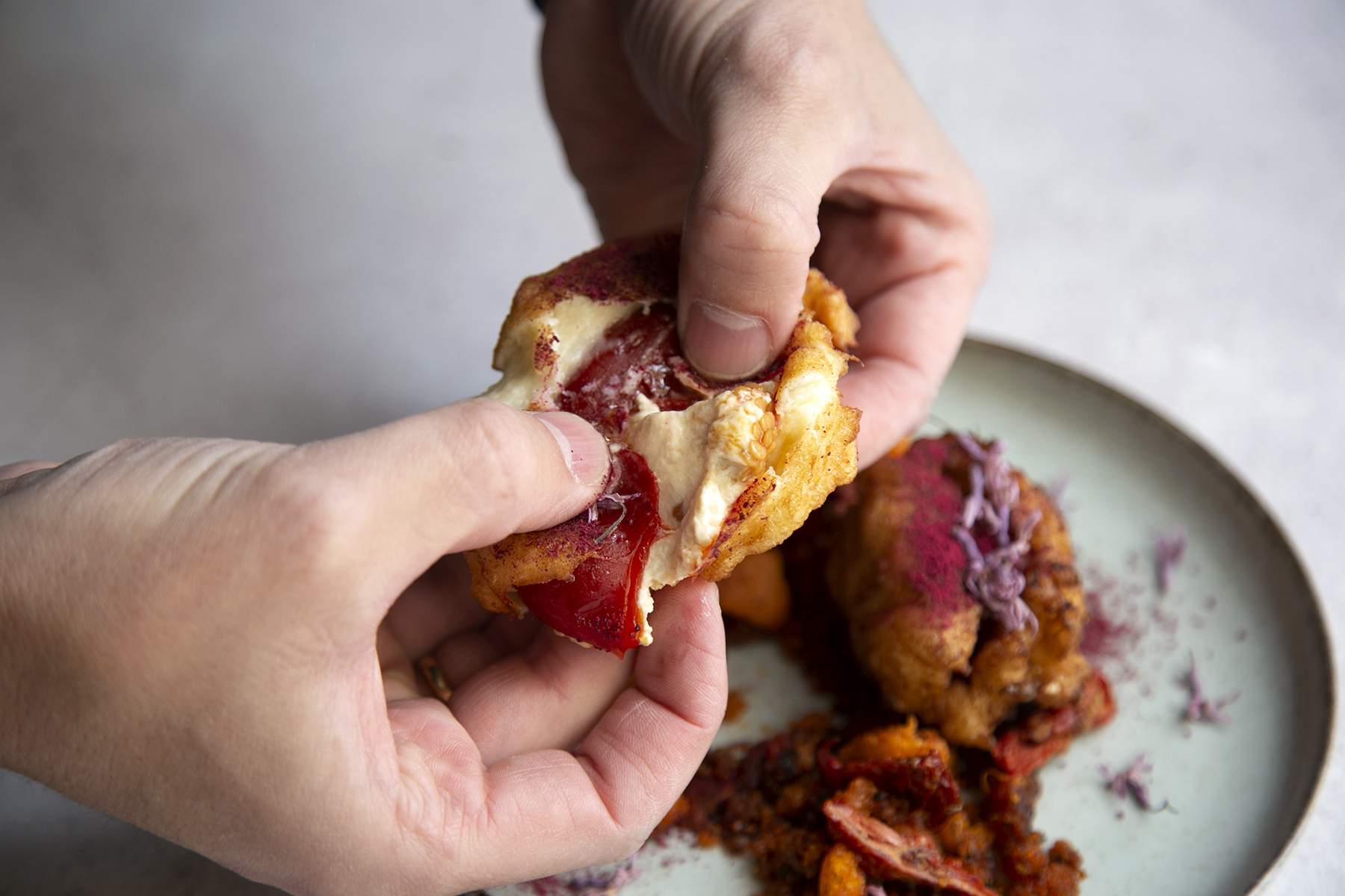 - Presentar una cama de migas de tomate, encima los buñuelos y decorar con perejil y remolacha en polvo. (Opcional flor de ajo).