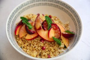 Ingredientes (4 personas) 300 g de arroz integral 600 ml de agua Sal Pasas Pavía Ciruela Granada Brotes de lechugas Almendras fileteadas Coco rallado tostado