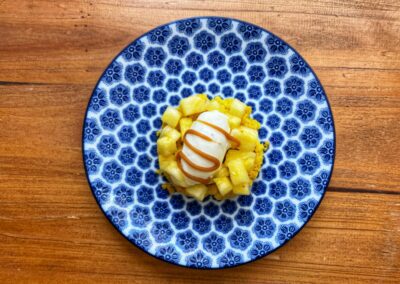 - Tartar de piña con galleta de cúrcuma y helado de coco